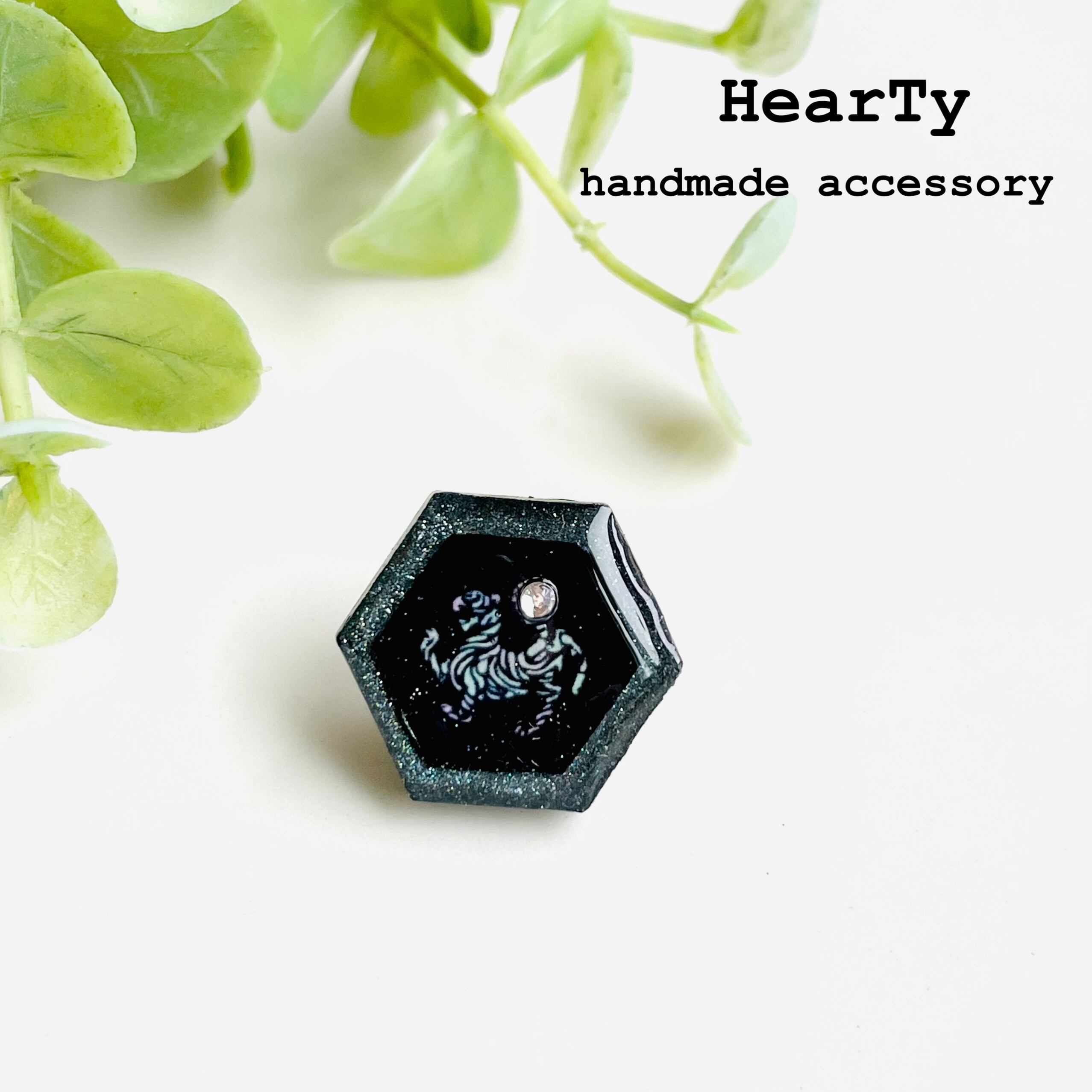 ダークブルーのレジンの上にブルーグリーンのミラーパウダーをチップで叩くように乗せ、オーロラカラーの虎マークを乗せて、最後に一粒のスワロフスキーを乗せたピンを作りました。