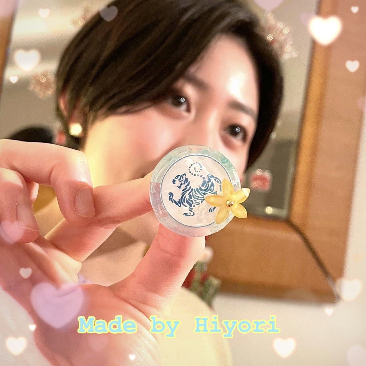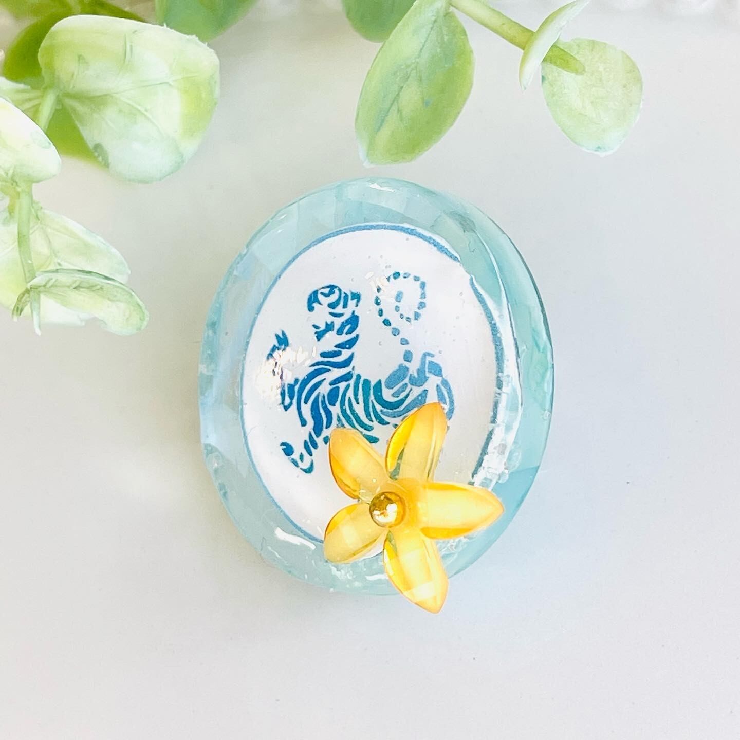 丸い型にブルーのシェルを敷き詰めて透明なレジンを入れ、その上にブルーのグラデーションの虎を入れて固め、最後にイエローのお花を飾ったバッチを作りました。