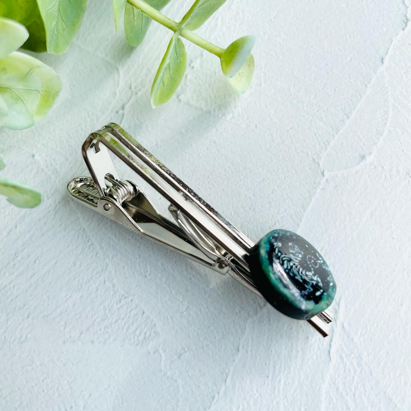 オーロラの虎マークとグリーンのシェルをレジンの中に入れて固め、シルバーのネクタイピンに付けました。