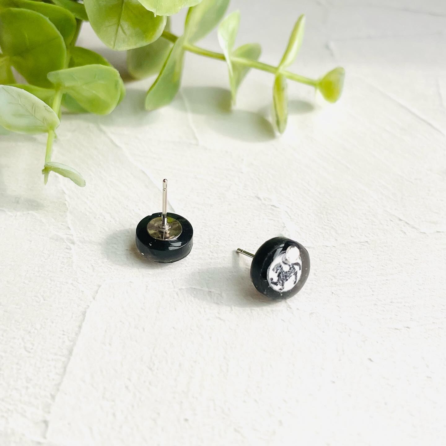 黒のレジンの上に白に黒の虎マークを乗せ、上に一粒のスワロフスキーを乗せたピアスを作りました。