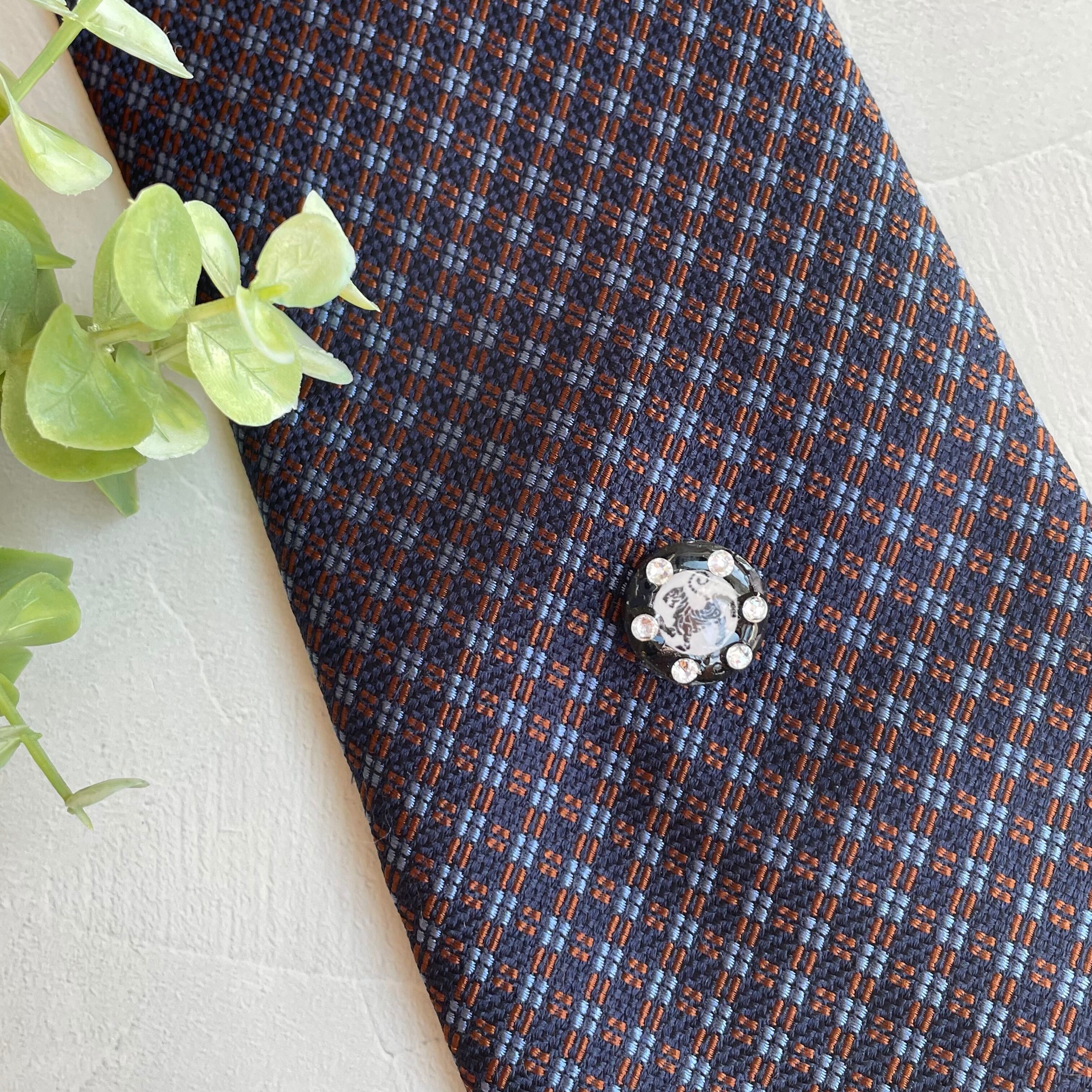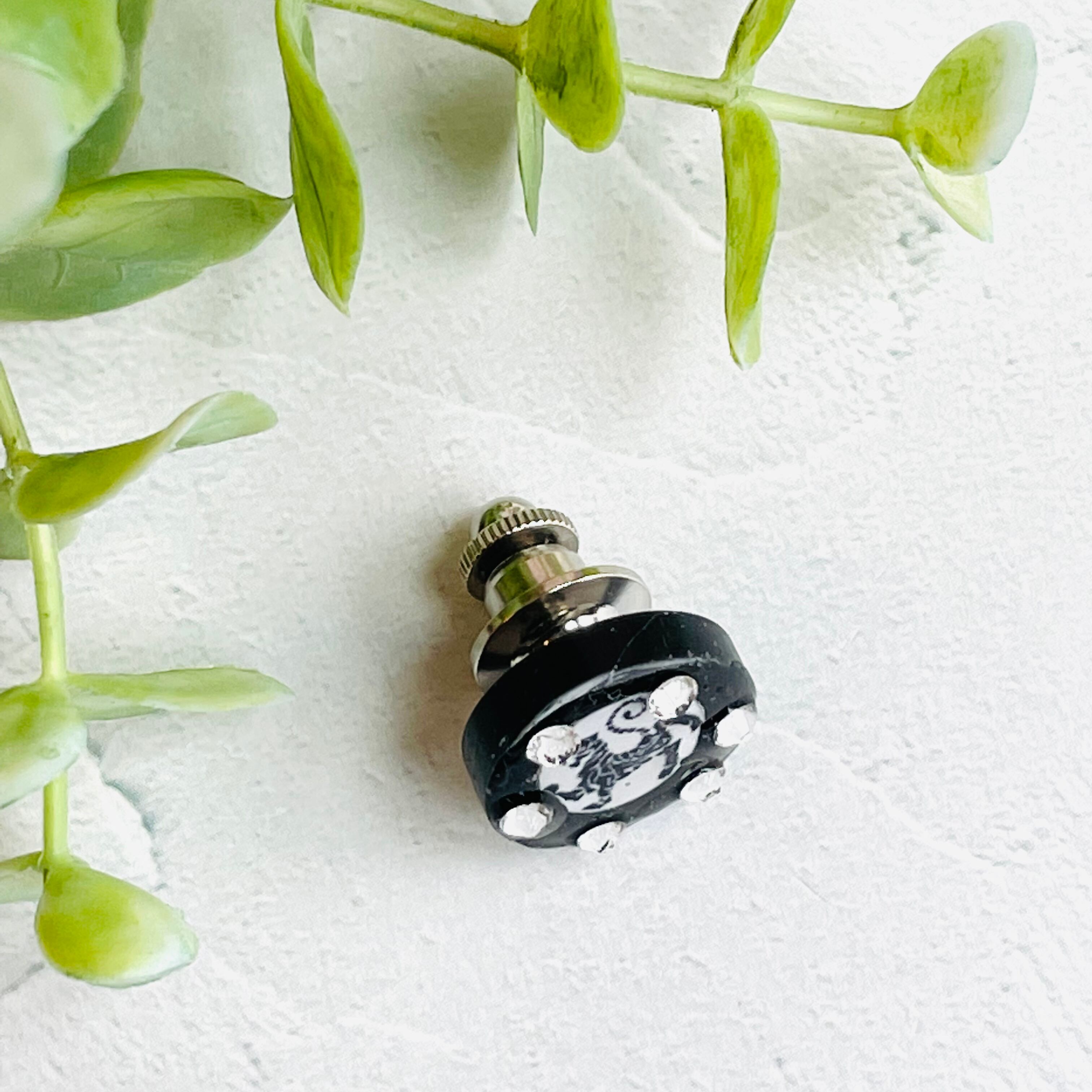 黒のレジンの上に、白に黒の虎マークを乗せ固め、6粒のスワロフスキーを乗せたピンを作りました。