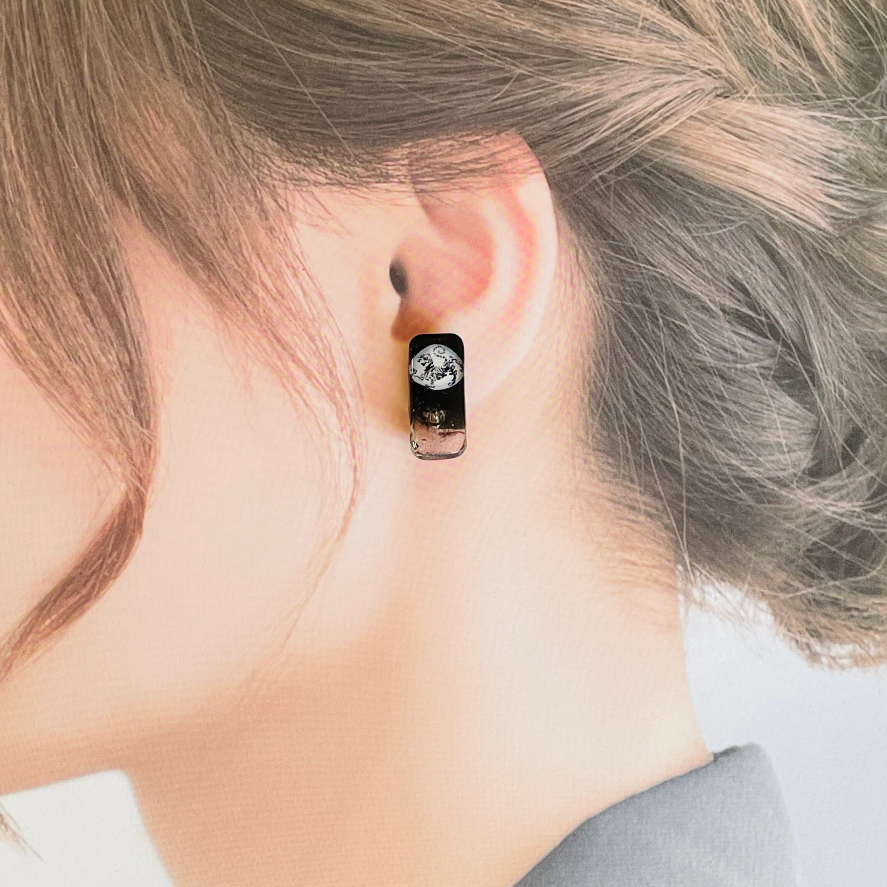 スクエア型にレジンをブラックとクリアのツートンカラーにし、その上に虎マークを乗せ、イヤリングを作りました。
