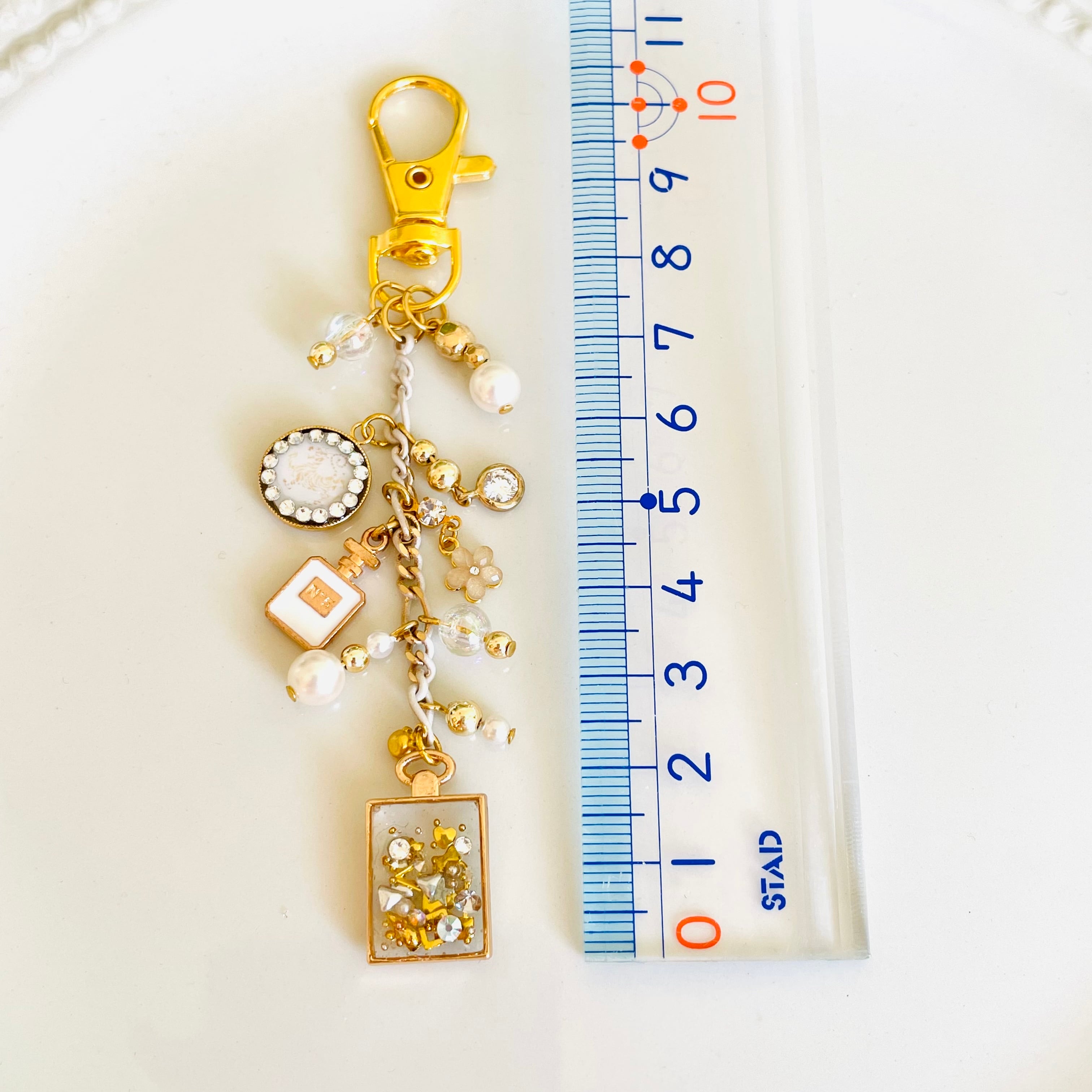 ホワイトのチェーンに虎マークや香水、パールなどのビーズを付けた、じゃらじゃらストラップを作りました。