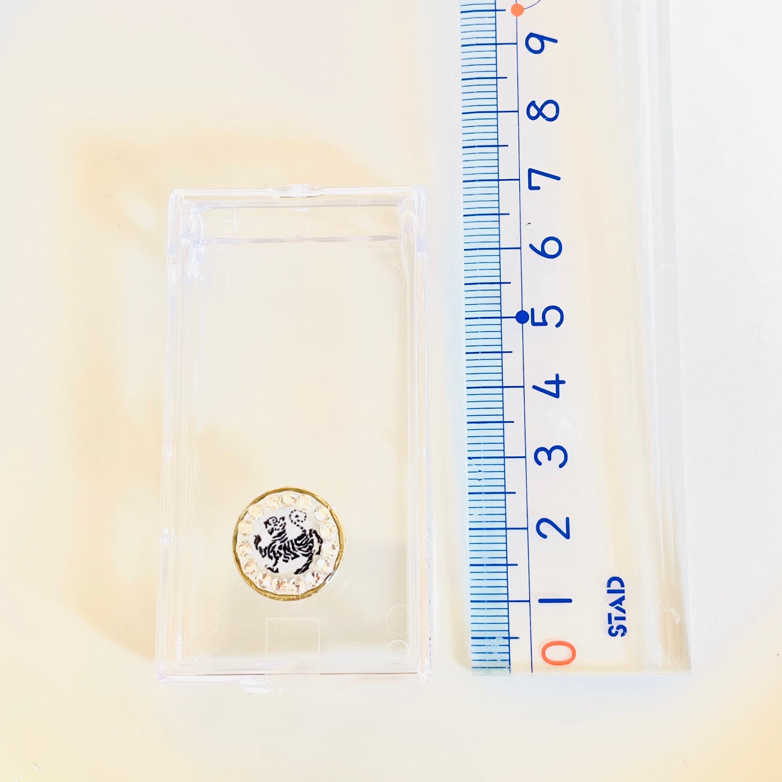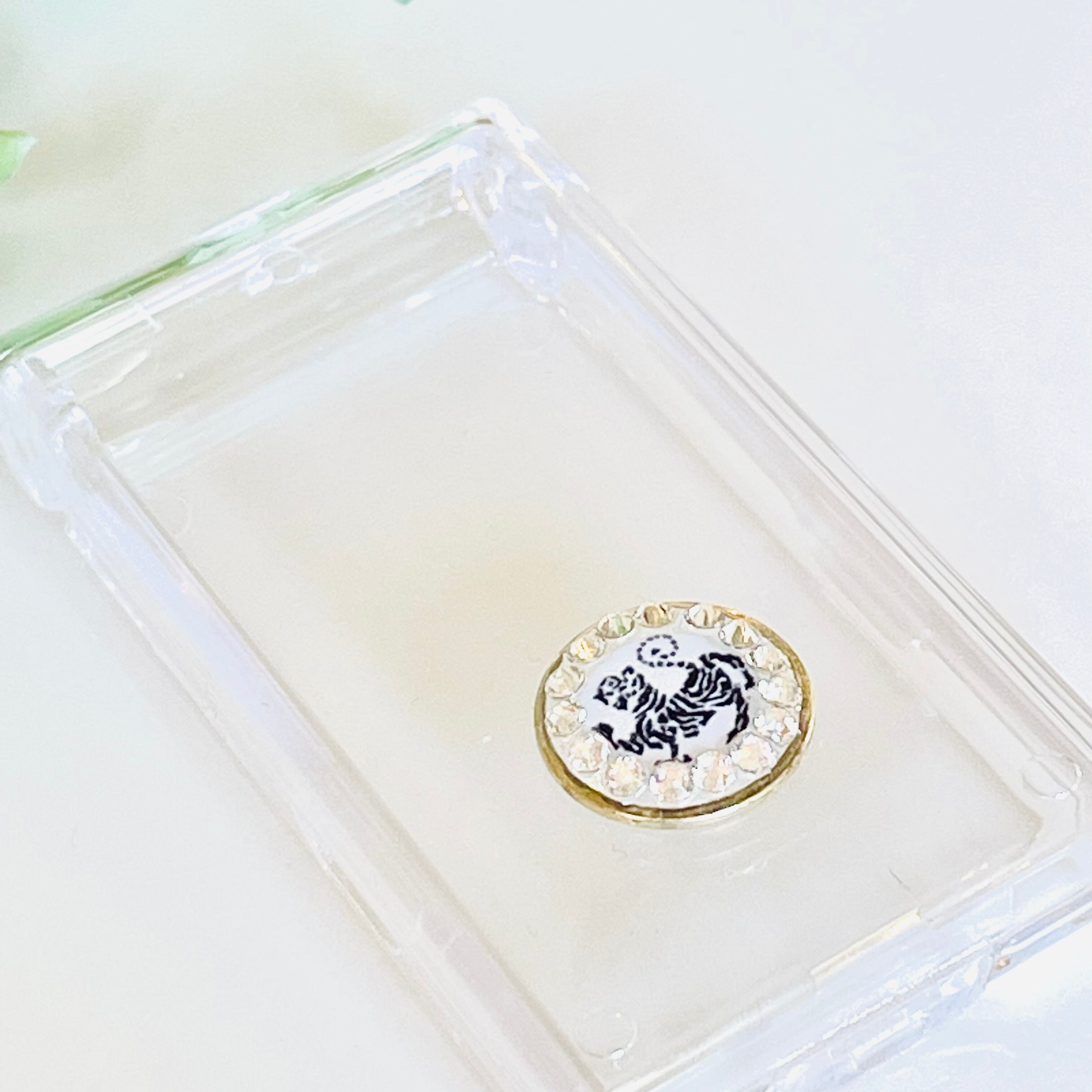 虎マークをスワロフスキーで囲み、レジンでコーティングした飾りを透明な小物入れに付けました。