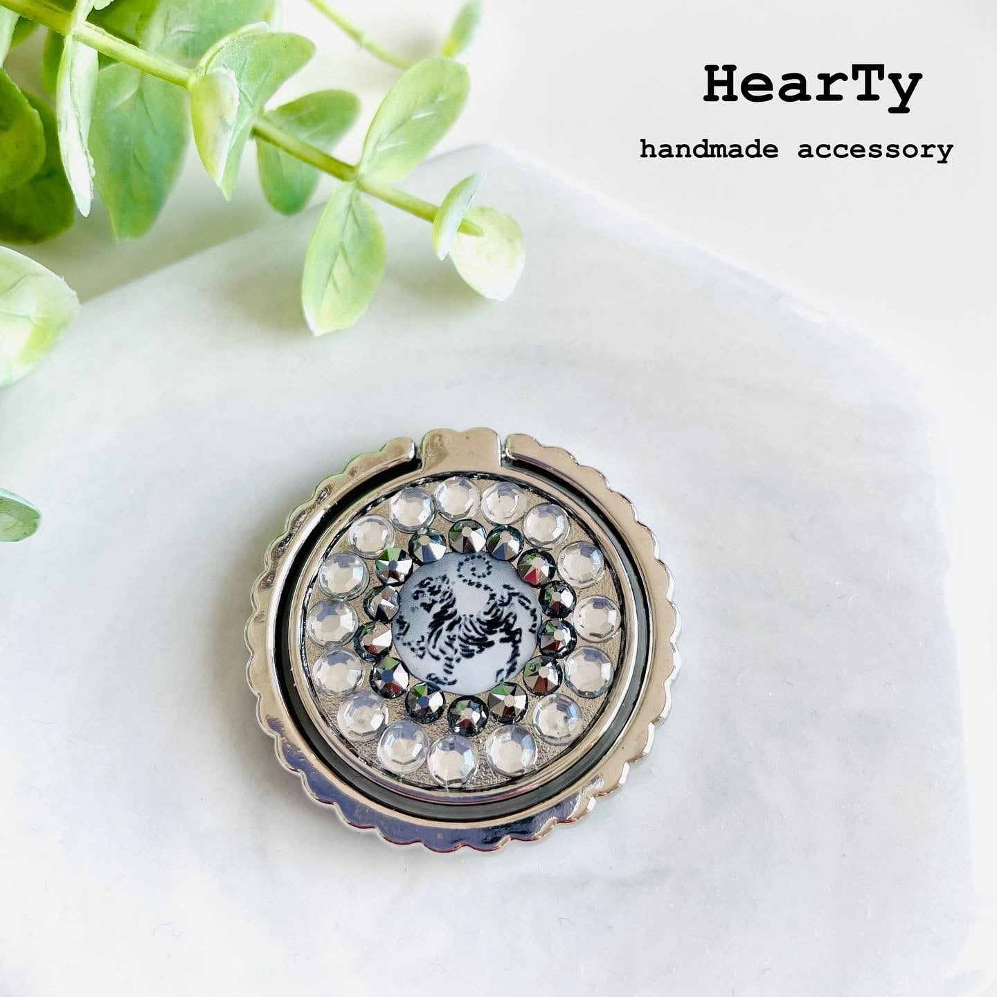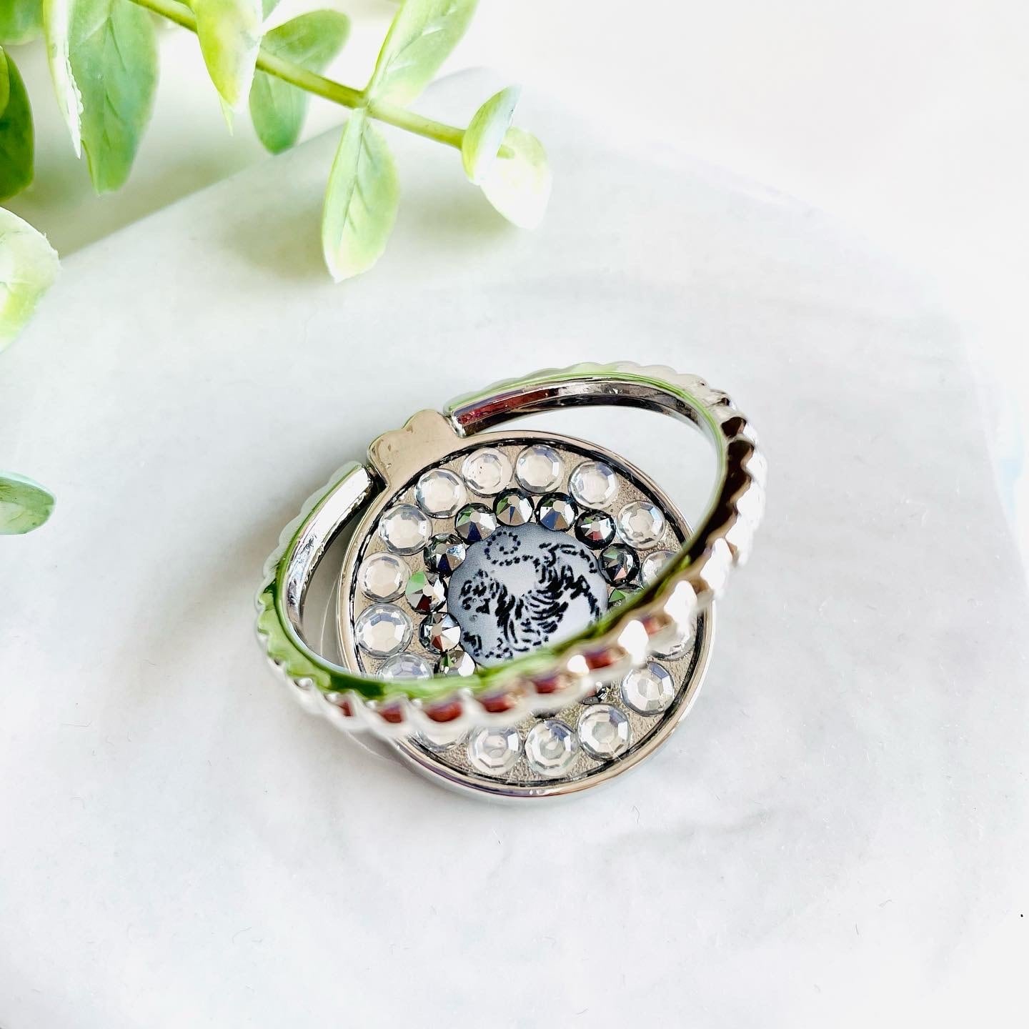 メタリックな虎の回りをクリアとブラックのスワロフスキーで飾ったスマホリングを作りました。