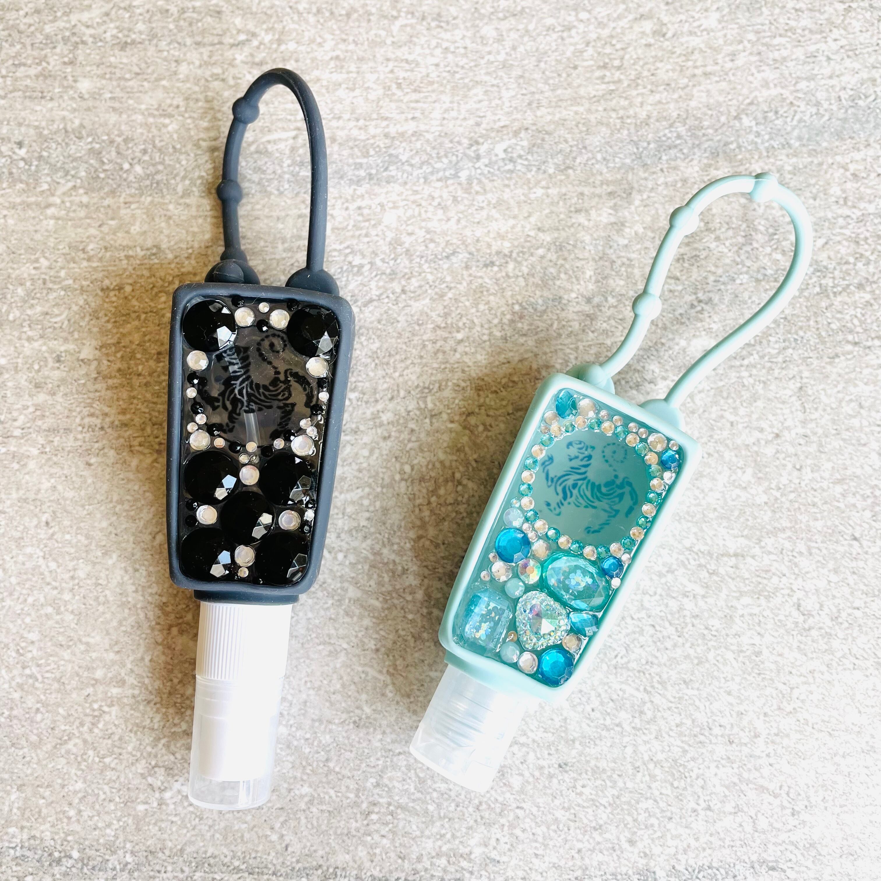 アルコールスプレーのボトルに、黒い虎とラインストーンを一面に散りばめレジンで固めました。