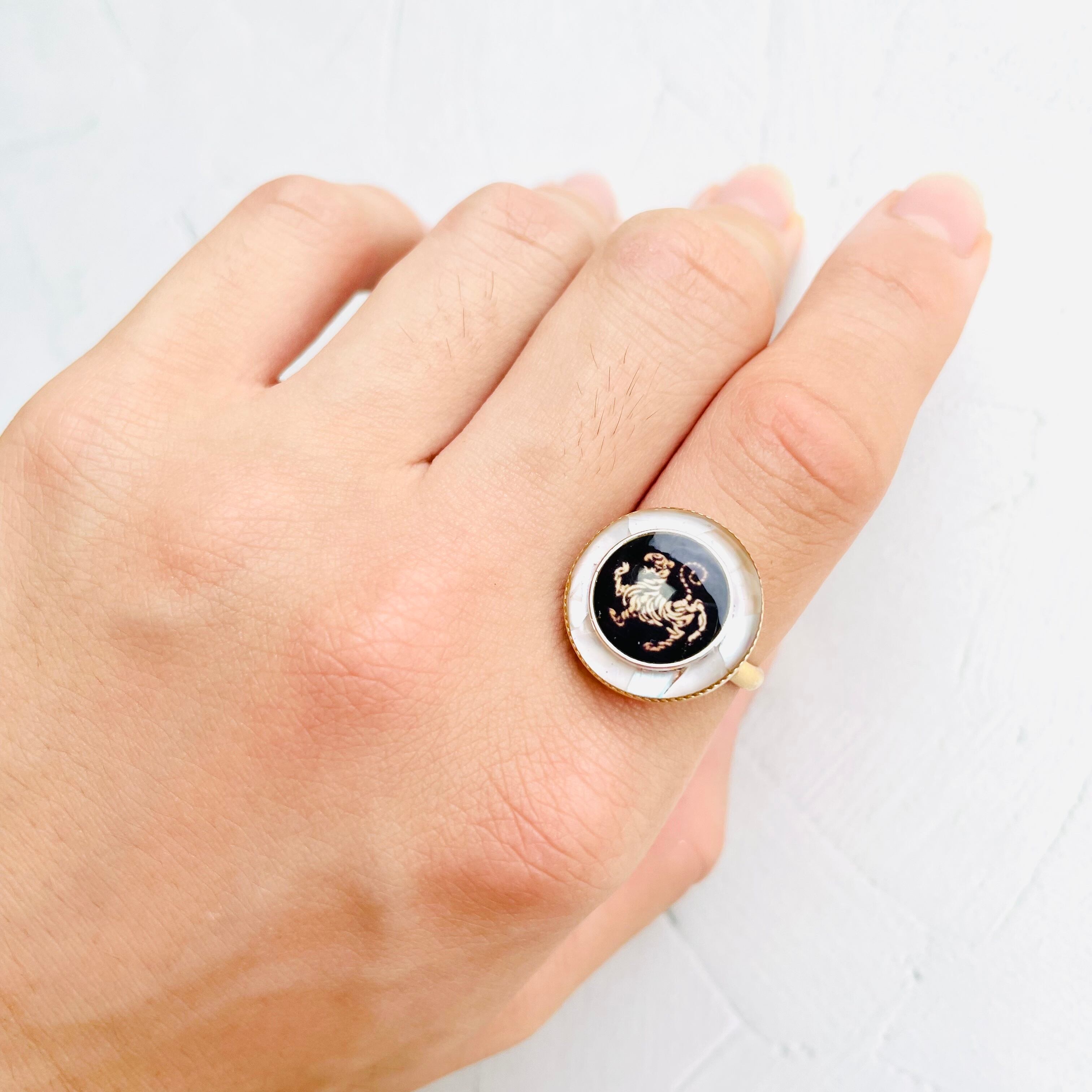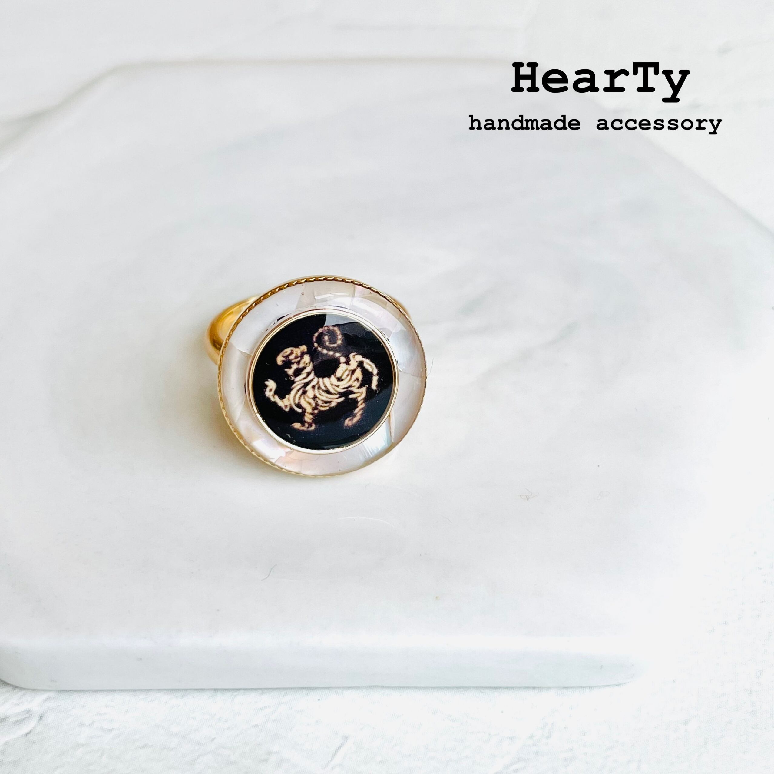 ゴールドのリングにホワイトのシェルを敷き詰め、ブラック×ゴールドの虎を載せたゴージャスなリングを作りました。