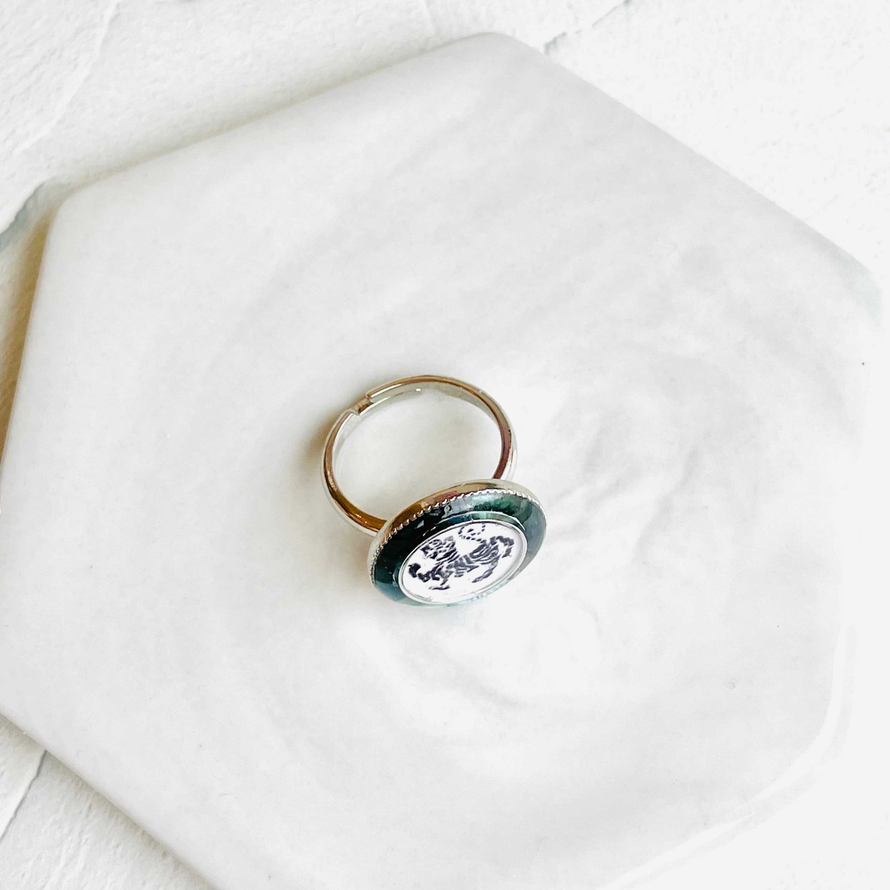 シルバーのリングにグリーンのシェルを敷き詰め、ブラック×ホワイトの虎を載せたゴージャスなリングを作りました。