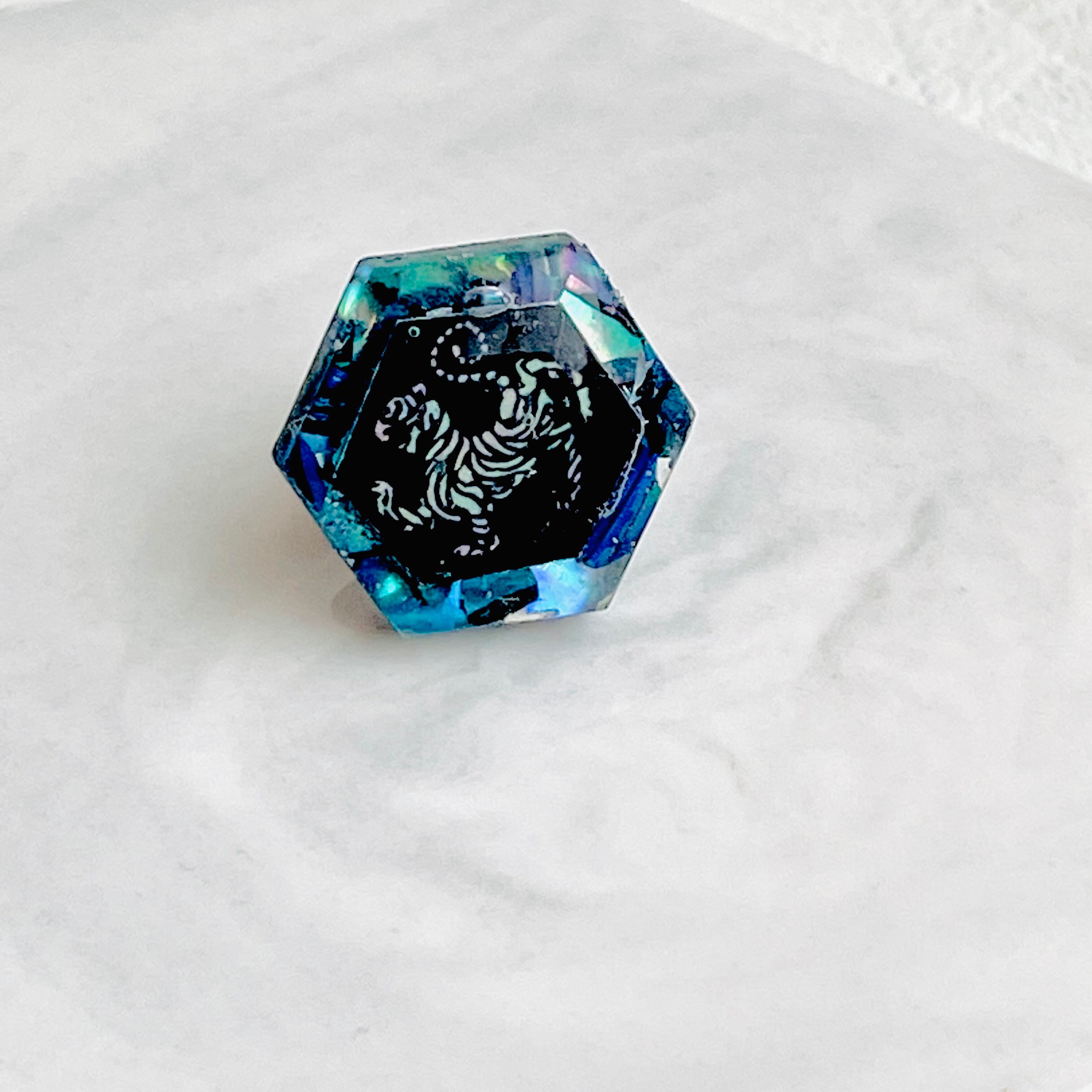 六角形の型にレジンを流し入れ、そこにグリーンとブルーのシェルを敷き詰め、その上に虎マークを乗せました。
